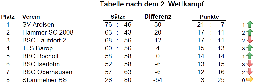 Die Entwicklung des Tabellenstandes im Laufe der einzelnen Wettkampftage könnt Ihr hier verfolgen. Am ersten Wettkampftag konnte der BSC Oberhausen mit drei Siegen in den ersten drei Matchen gut starten. Leider gingen die Matche 4, 5 und 6 verloren, im 7. Match konnte dann noch ein Unentschieden geholt werden. Somit belegt der BSC Oberhausen nach dem ersten Wettkampftag den 5. Rang, punktgleich mit Hamm und Bocholt.